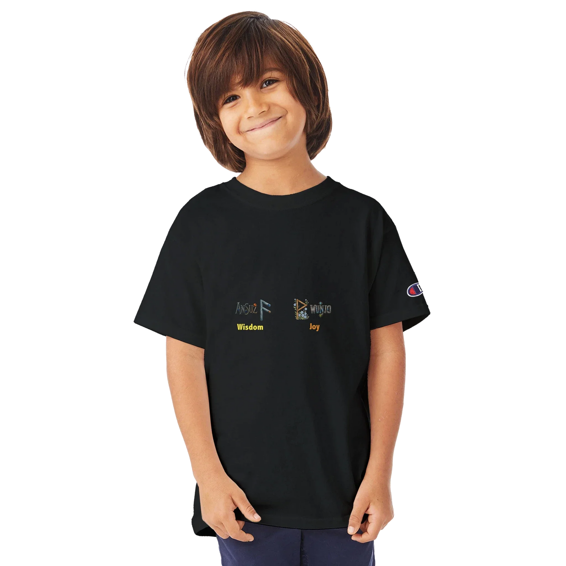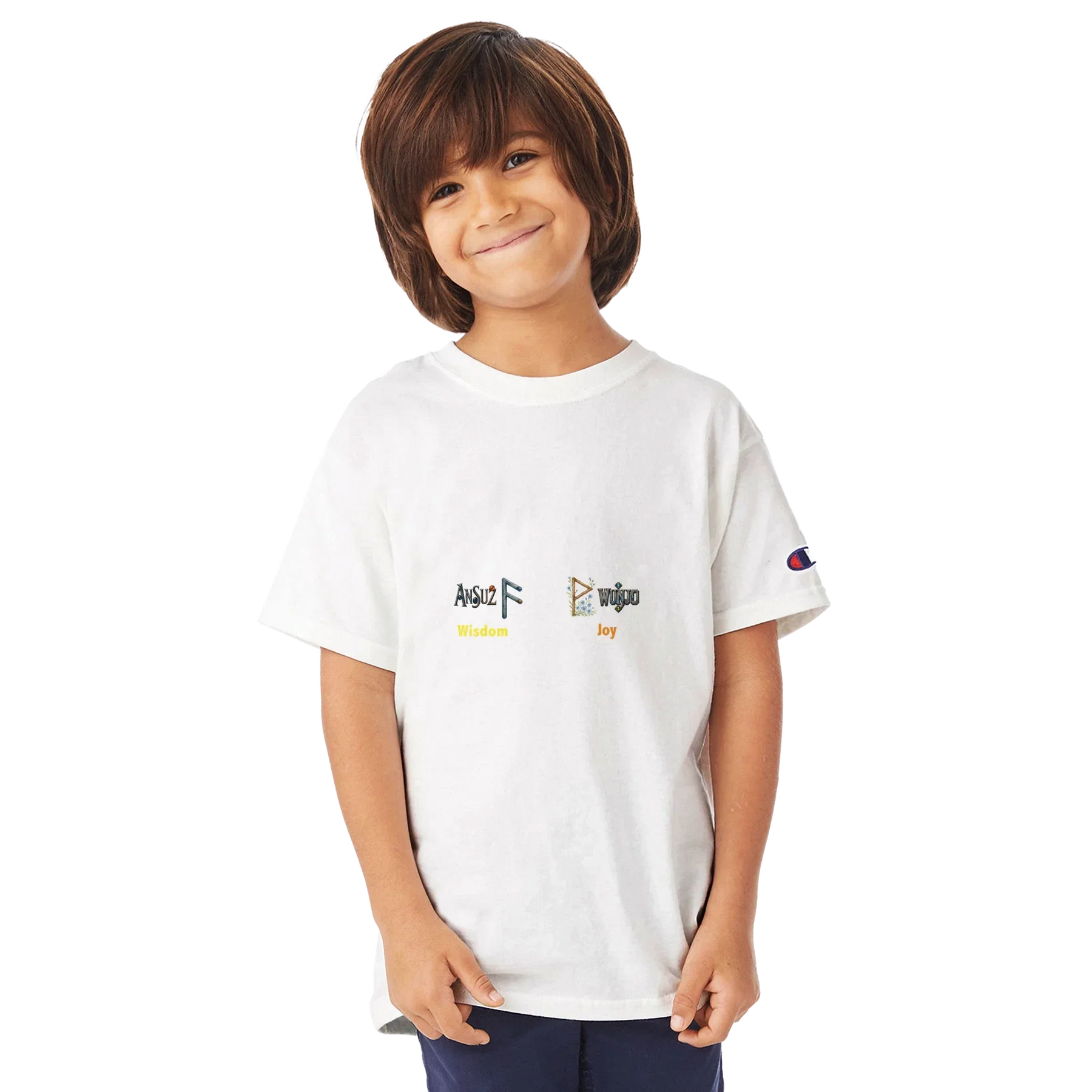 This custom RuneScope Kids Tee shows your child’s Birth Rune and Fate Rune, joined with an &, and personalized with two uplifting words that you fill in.